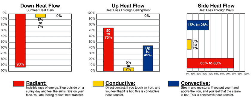 Most people are familiar with traditional insulating materials such as cellulose, fiberglass and styrofoam. These products use their ability to absorb or resist convective and conductive heat transfer to insulate. This is often referred to as R-value. A third, seldom discussed but larger form of heat transfer exists: radiant heat transfer. These diagrams show the differences between the three forms of heat transfer.