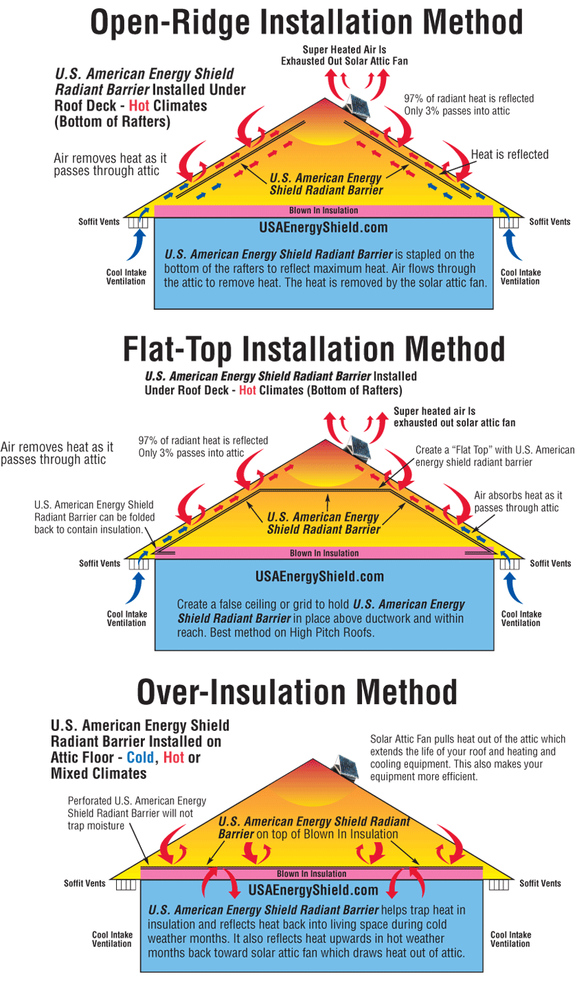 Energy Shield Radiant Barrier insulation is a reflective insulation system that offers a permanent way to reduce energy costs. Energy Shield Radiant Barrier insulation reflects radiant heat energy instead of trying to absorb it. It is a 99% pure aluminum perforated product laminated on both sides with a heavyweight tear-proof polyethylene scrim center. It will reflect over 97% of the radiant heat entering your attic and then your living area. It has no R-Value. But since it acts like "shade" it makes existing insulation more effective.